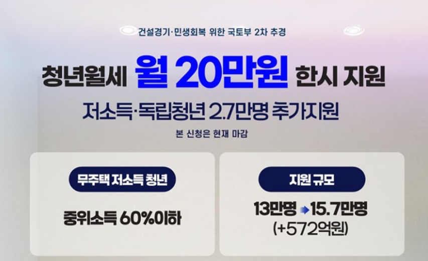 국토교통부(중앙정부)는 만 19~34세 무주택 청년에게 월 최대 20만원, 12개월간을 지원하며, 보증금 5천만원 이하, 월세 70만원 이하의 주택이 대상입니다.